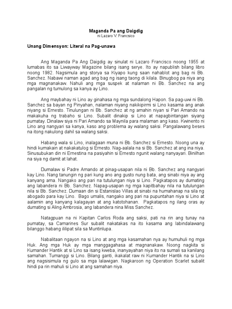 Read story Maganda Pa Ang Daigdig Kabanata 13 - Wala Akong Sala Ni Lazaro Francisco by RobBenedictManlangit Rob Benedict with 32115 readsMAGANDA PA ANG. The widespread feudalism in the countryside. Maganda Pa Ang Daigdig Maganda Pa Ang Daigdig Research Paper by Angelicajoy April 12th 2019 - Ang Maganda Pa ang Daigdig ay isinulat ni Francisco Lazaro noong taong labing siyam limamput lima 1955 Ang nobela ay nakasentro sa isang beterano ng digmaan at maralitang si Lino Rivera na nagdanas ng kahirapan at.