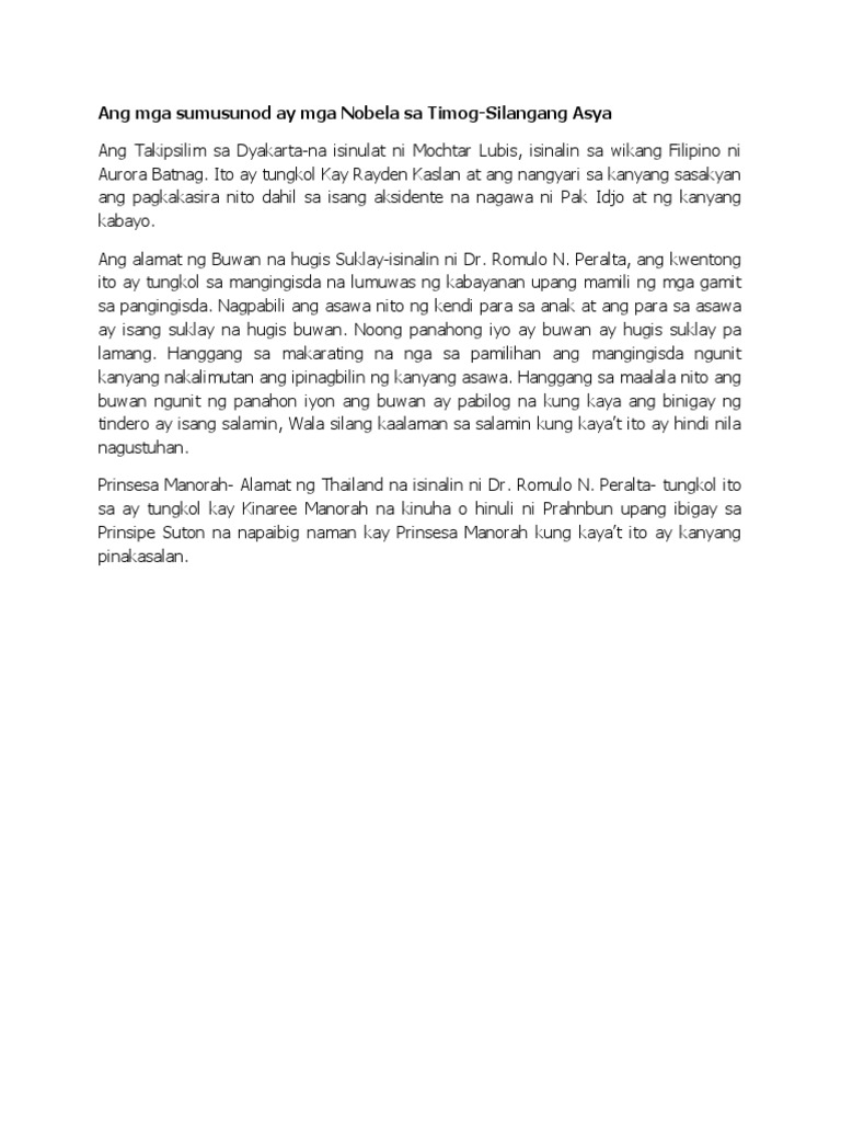 NOBELA MULA TIMOG-SILANGANG ASYA. Maikling kwento nobela dula alamat pabula talambuhay sanaysay balita ateditoryal. Basahin ang 5 Halimbawa ng Maikling Kwento na may Aral.